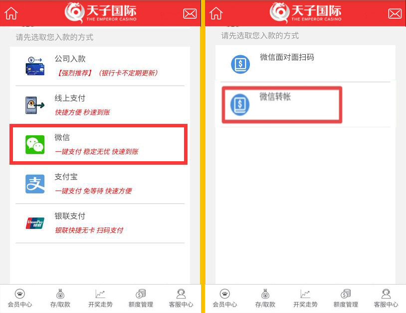 手机用户点击右上角登入,登入会员账号,点击屏幕下方导航中的存/取款--存款。再点击微信,选择微信转账