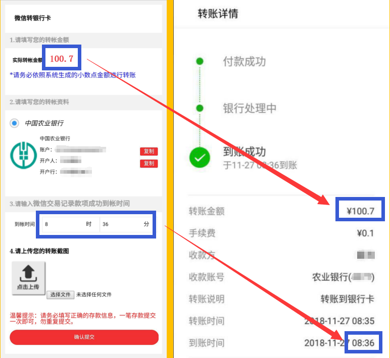 查看系统生成带有小数点的金额,记录好公司收款银行账户,使用微信进行转账(转账金额务必与带有小数点的金额一致);到账成功后按照提示填写到账时间,并上传您的转账详情截图,在点击确认提交(温馨提示:使用微信转账至平安银行是即时到账的; 务必先确认到账后,填写准确到账时间,再点击提交,否则财务人员查询不到款项无法第一时间帮您添加额度。)